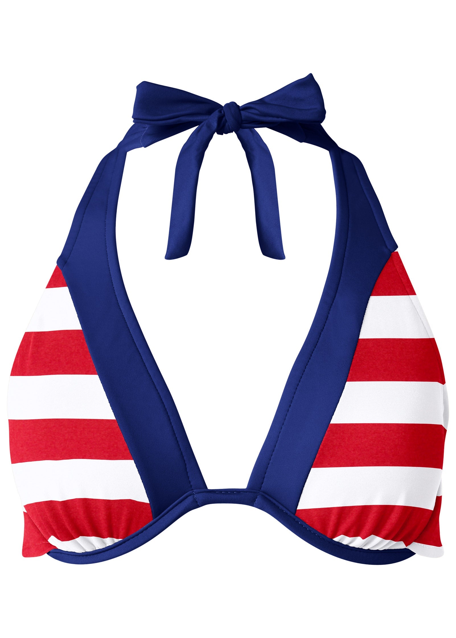 Dive into this classic halter-style bikini top for a timeless beach look. An underwire offers support. while wide straps comfortably tie around the neck to offer extra lift. With no padding. this top is a perfect choice for those who prefer a more natural look. * Underwire support * Comfortable sashes tie behind neck * For printed items; placement may vary * No padding or cups * Some colors of this style are made of recycled fabric. For more information. see MORE DETAILS * BHV: Domestic or import of recycled nylon/spandex tricot * CTB: Domestic or import of poly/spandex tricot * All Other Colors: Domestic or import of nylon/spandex tricot